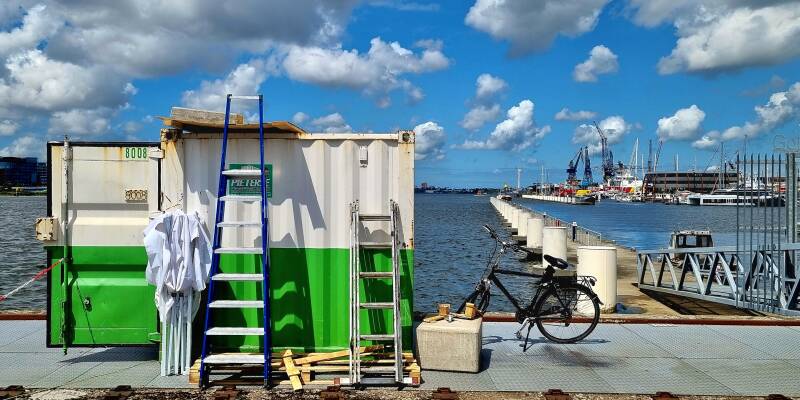 Foto boven: roeiboot met lange roeispanen in lucht.